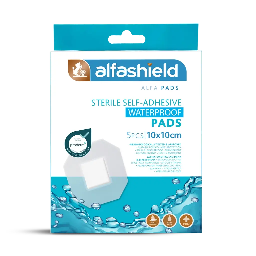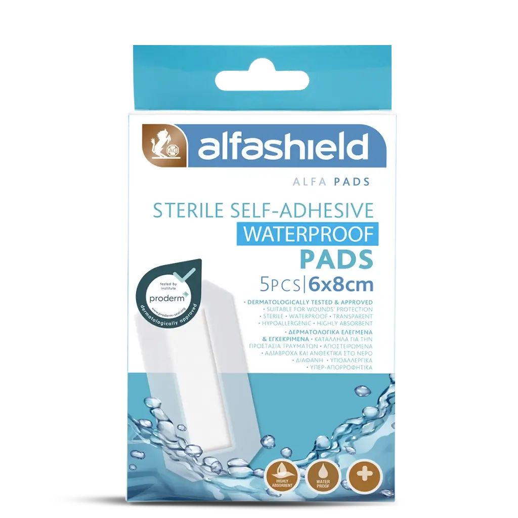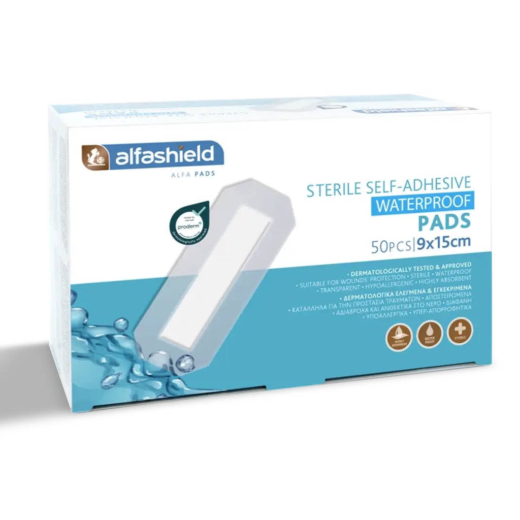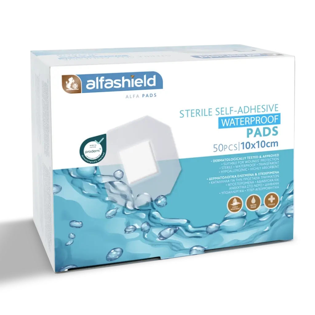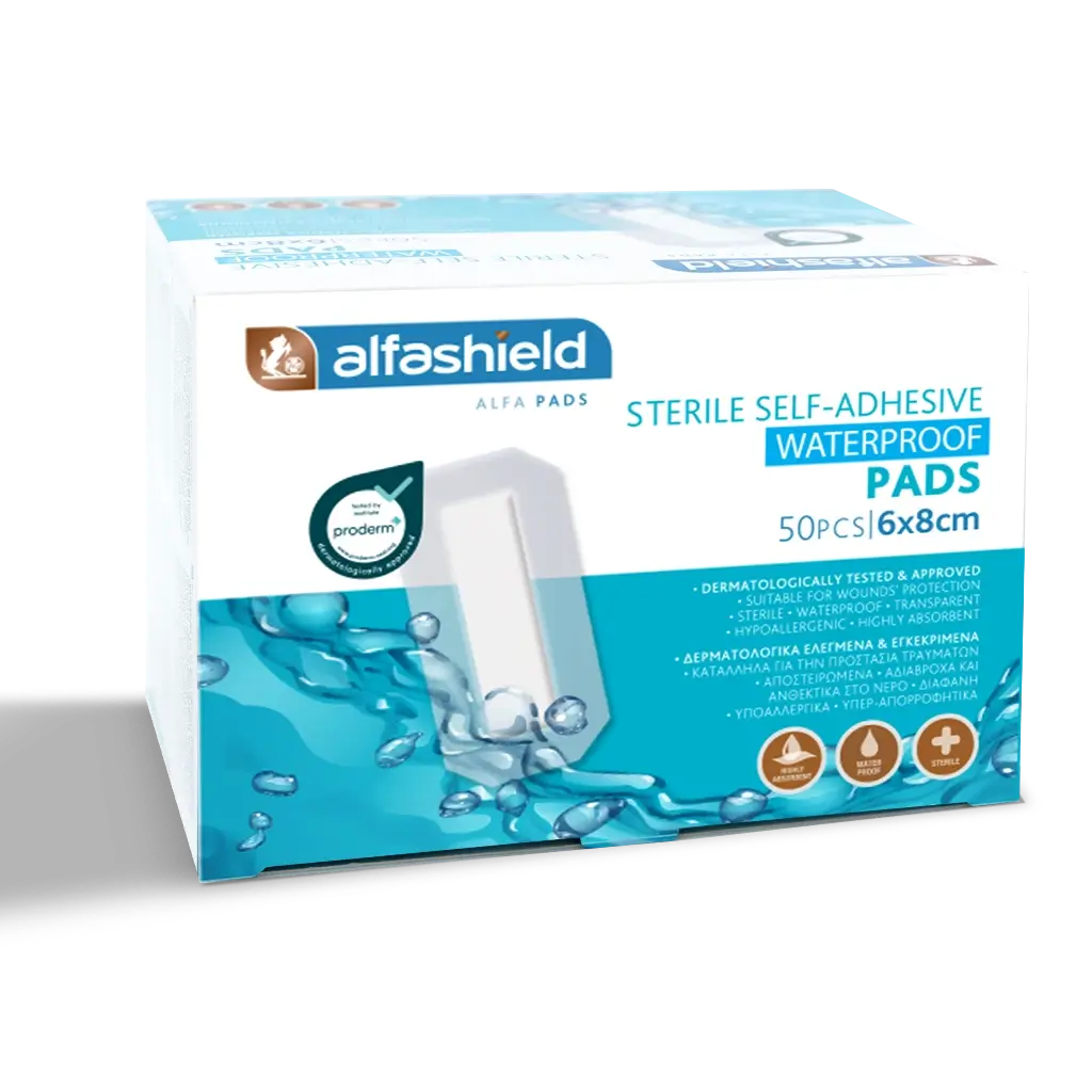 Alfashield | ALFA PADS Sterile Self-adhesive Pads Water-Proof are made of film PU, with non-adherent surface coming in contact with the wound. The pads are highly durable and do not cause irritation and allergic reactions. With a strong adhesive which seals all around the wound, they remain stable and protect ideally the wound. The non-stick wound pad protects gently the wound. They have a thin absorbent pad with a protective film that helps absorption of wound exudate. These water-proof and breathable pads keep the wound dry and are ideal during washing, showering, bathing and swimming.