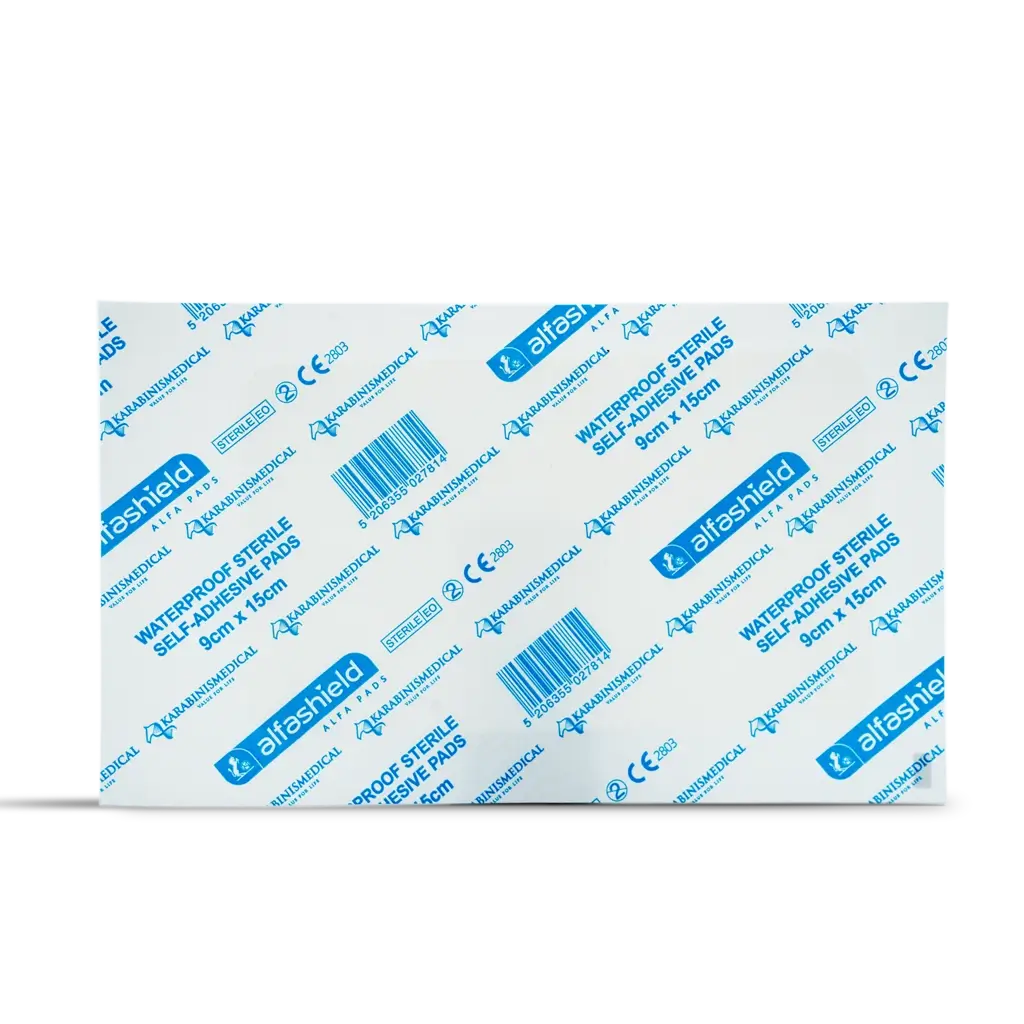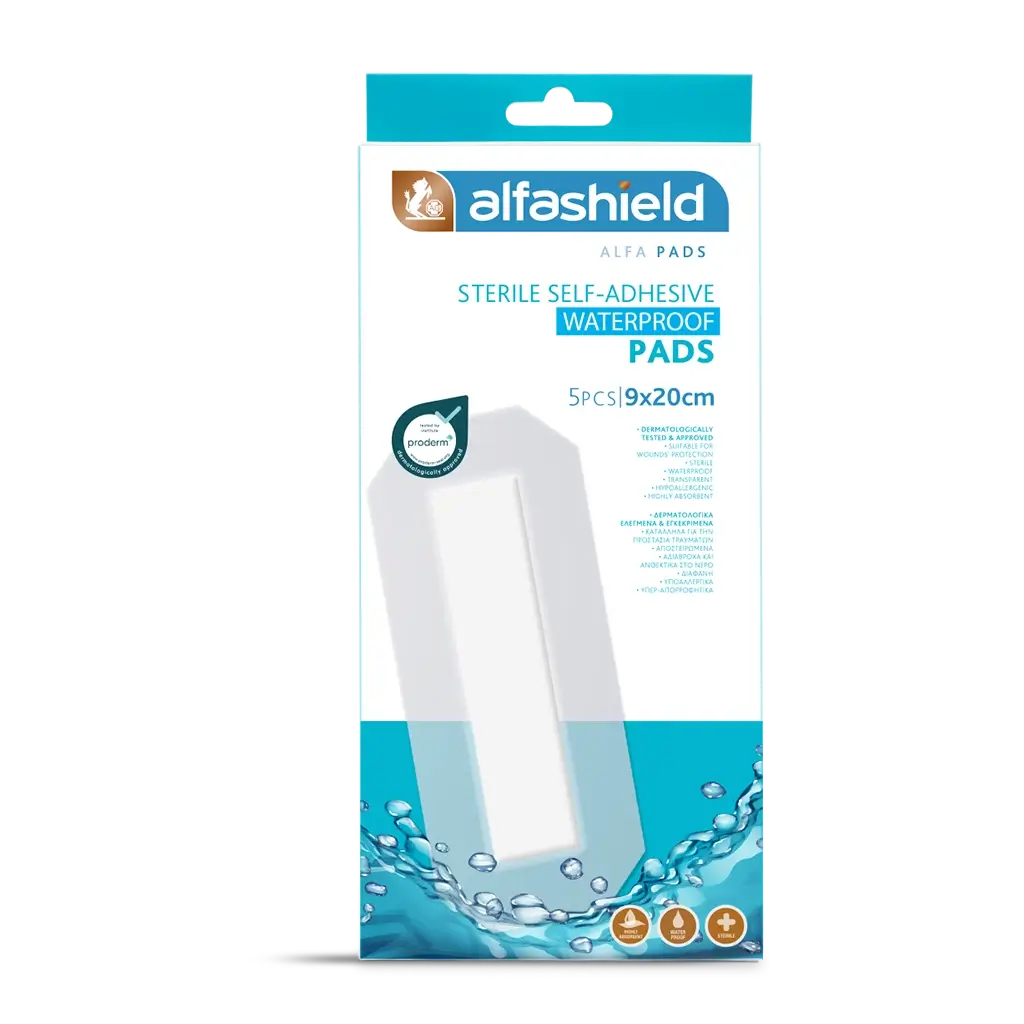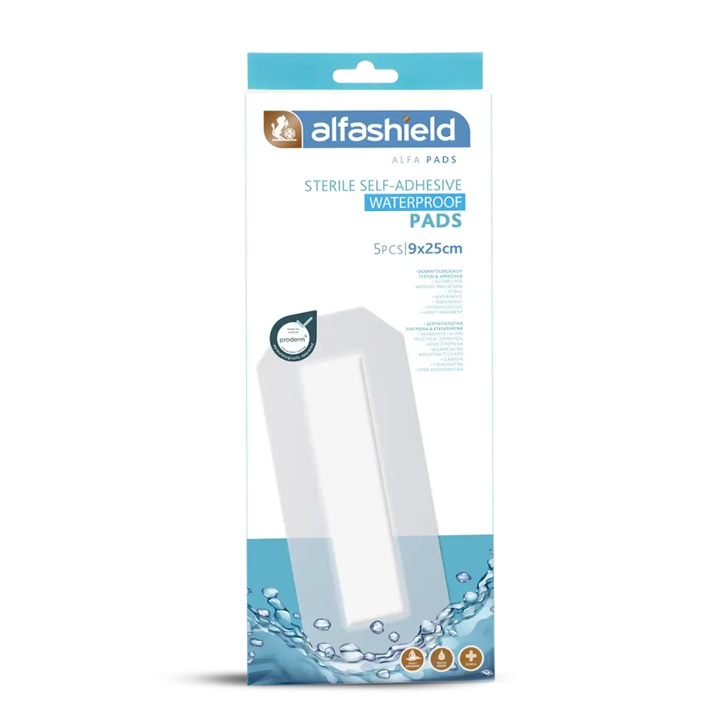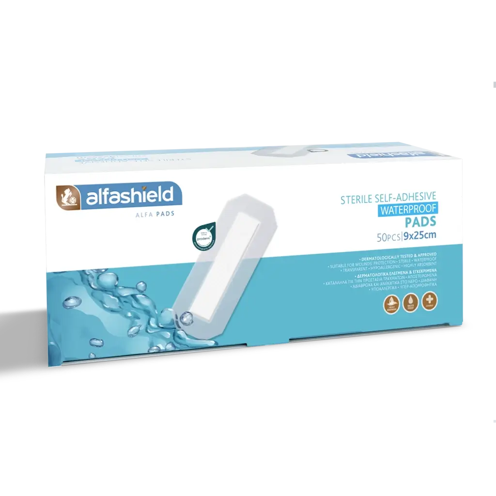 Alfashield | ALFA PADS Sterile Self-adhesive Pads Water-Proof are made of film PU, with non-adherent surface coming in contact with the wound. The pads are highly durable and do not cause irritation and allergic reactions. With a strong adhesive which seals all around the wound, they remain stable and protect ideally the wound. The non-stick wound pad protects gently the wound. They have a thin absorbent pad with a protective film that helps absorption of wound exudate. These water-proof and breathable pads keep the wound dry and are ideal during washing, showering, bathing and swimming.